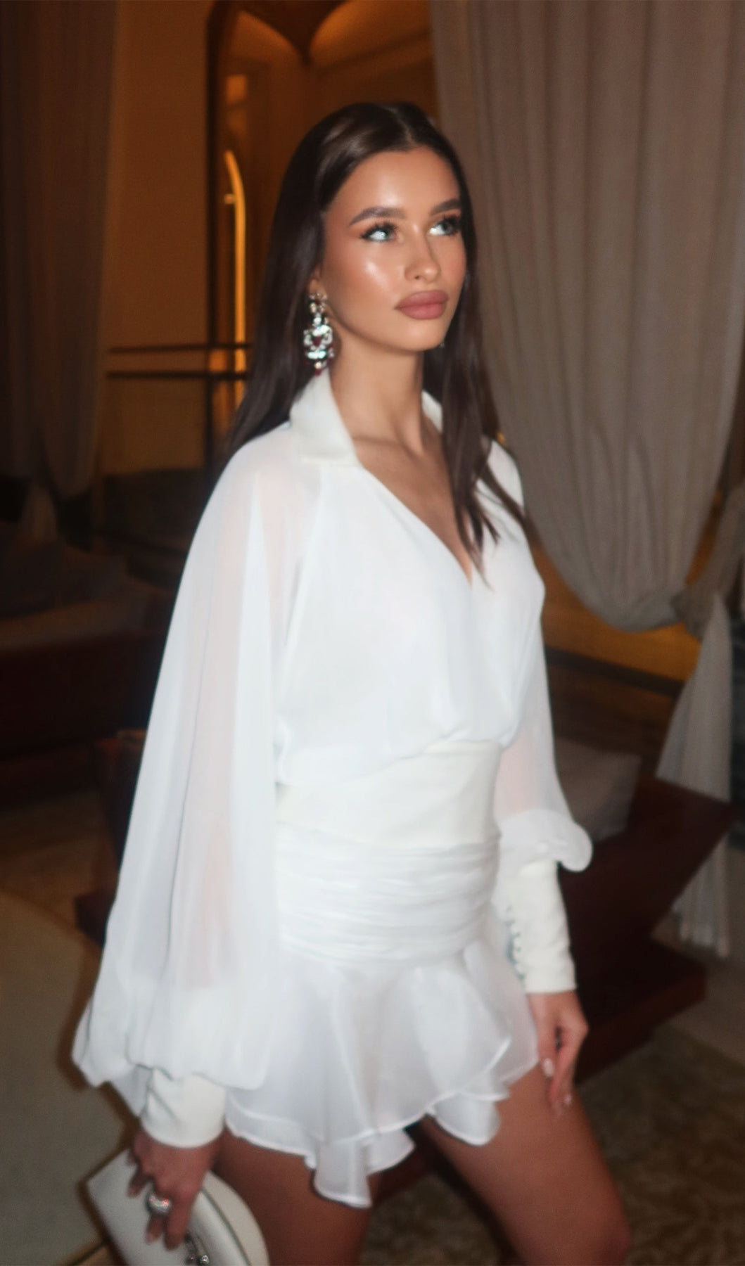 This chic white mini dress is all about graceful movement and timeless style. Featuring billowy long sleeves, a structured waistline, and a soft ruffle hem, it strikes the perfect balance between sophistication and flirtiness. Whether you're attending a summer soirée or dining under the stars, this dress is your go-to for effortless elegance.